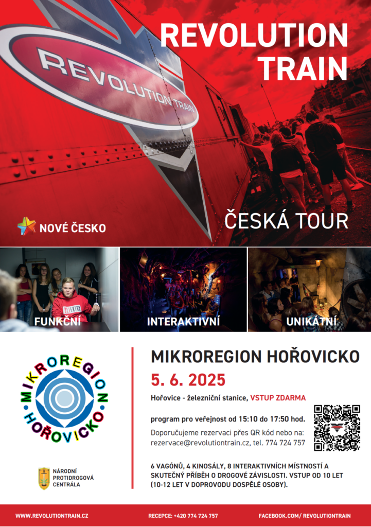 Projekt REVOLUTION TRAIN se zaměřuje na originální přístup k primární protidrogové prevenci – v prostorách multimediální mobilní vlakové soupravy. 5. 6. 2025 v Hořovicích. Leták organizátorů: